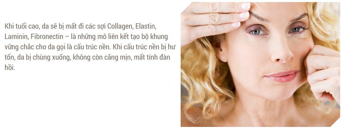 Sau tuổi 30, hệ trục “vàng” Não bộ – Tuyến yên – Buồng trứng suy giảm hoạt động làm rối loạn bộ hormone nữ (Estrogen, Progesterone, Testosterone) dẫn đến những trục trặc về sức khỏe, sinh lý, đặc biệt là sự xuống cấp của làn da. Song song đó, làn da còn chịu tác hại của tia cực tím từ ánh nắng mặt trời và các yếu tố bên ngoài khác làm cơ thể sản xuất nhiều chất độc hại Ros (Reactive Oxygen Spcecies), từ đó, men tiêu hủy cấu trúc nền MMPs cũng sản sinh nhiều và tăng cường phá hủy cấu trúc protein dạng sợi (Collagen, Elastin, Laminin, Fibronectin) làm hư hại cấu trúc nền. Đây là nguyên nhân chính khiến da bị lão hóa.