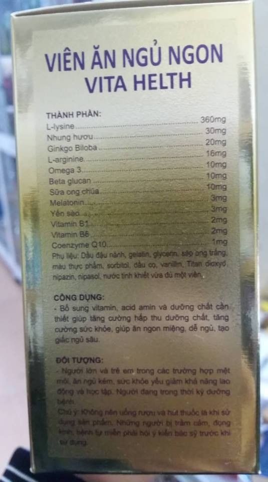 Thực phẩm bảo vệ sức khỏe Viên ăn ngủ ngon Vita Health bổ sung vitamin, acid amin và dưỡng chất cần thiết giúp tăng cường hấp thu dưỡng chất, tăng cường sức khỏe, giúp ăn ngon miệng, dễ ngủ, tạo giấc ngủ sâu.